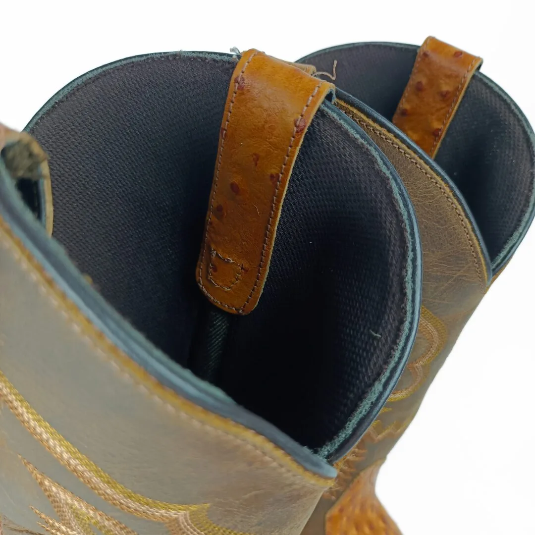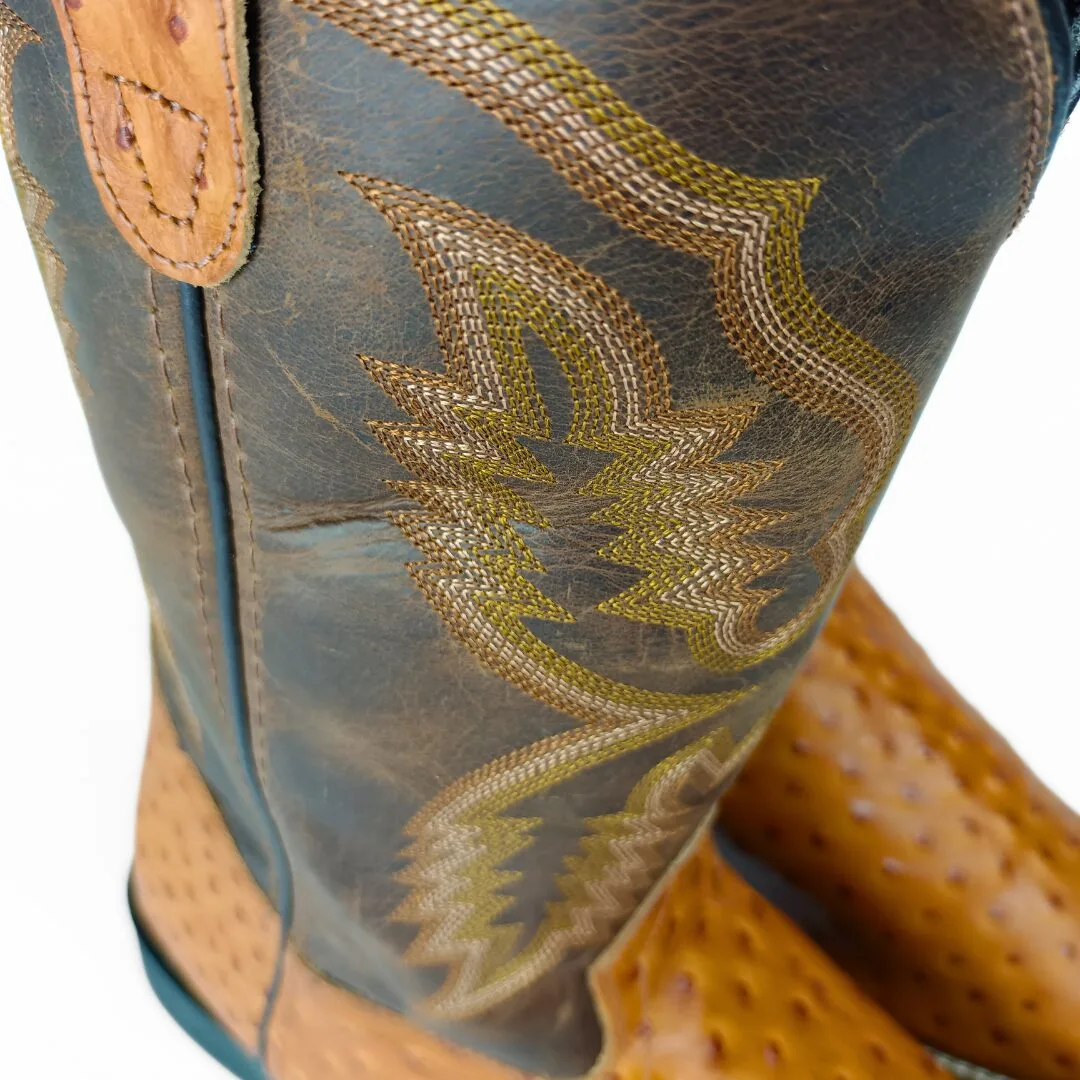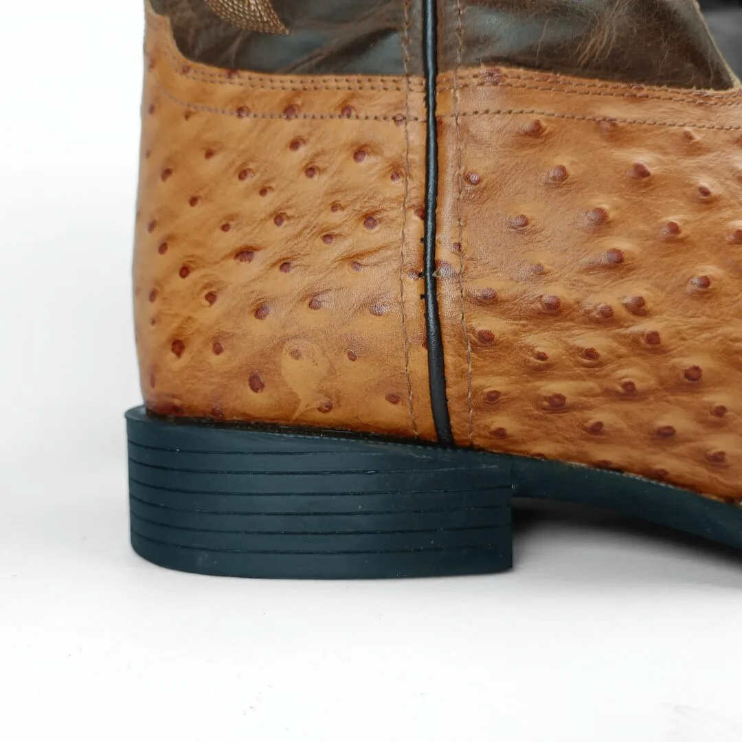 The Garza Men’s Western Boots combine exotic-inspired style with everyday comfort. Built with a tan ostrich-embossed leather vamp and a brown leather shaft, these boots stand out with their unique texture and bold western appeal. Featuring a wide square toe, feather western stitch design, and 12-inch shaft, they deliver a look that is both rugged and refined.