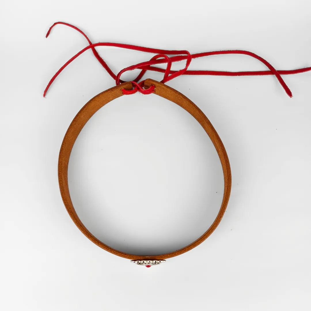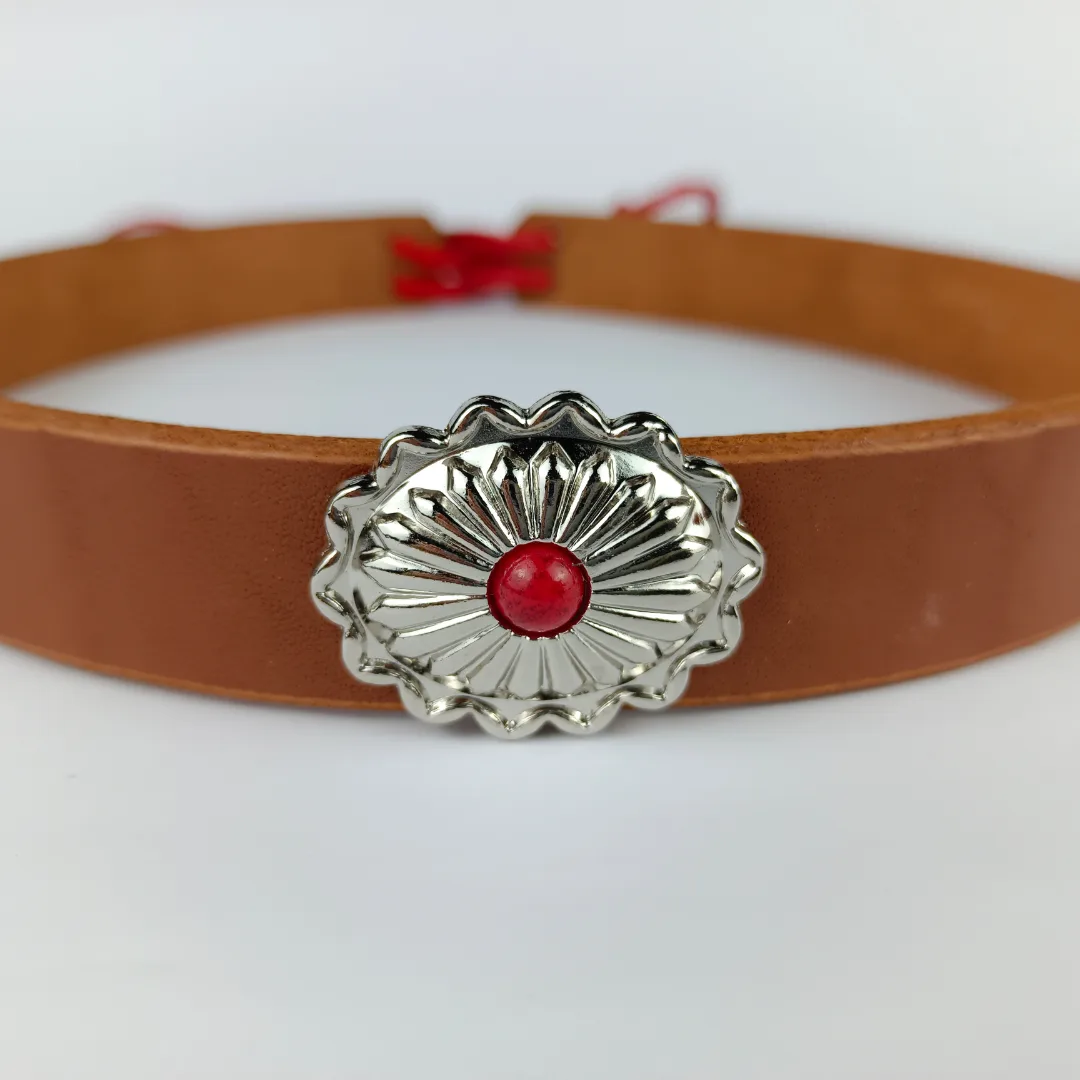 This tan leather hatband features alloy conchos with a striking red-style inlay—adding just the right pop of colour to your hat. Handcrafted with care and finished with red leather tie strings for a secure, adjustable fit.