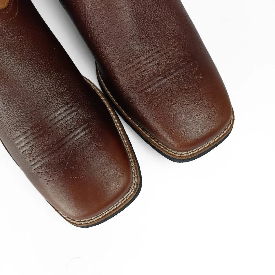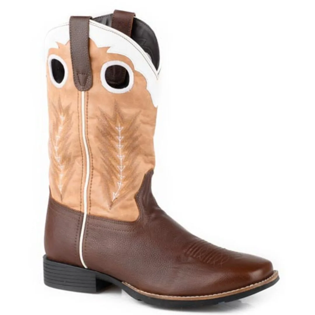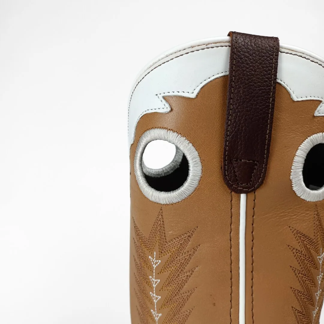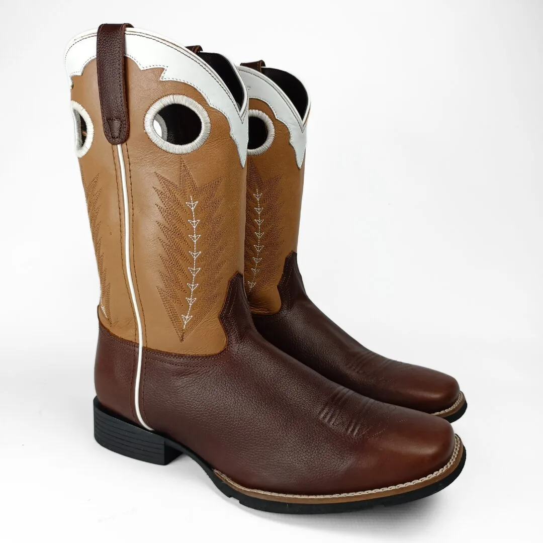 The Men’s James Square Toe Leather Boot blends timeless Western style with modern-day comfort. Featuring a brown smooth vamp paired with a tan leather shaft, this boot is accented with a white leather crown and a distinctive feather Western stitch pattern. Embroidered pull holes add both function and flair, making it easy to pull on and off.