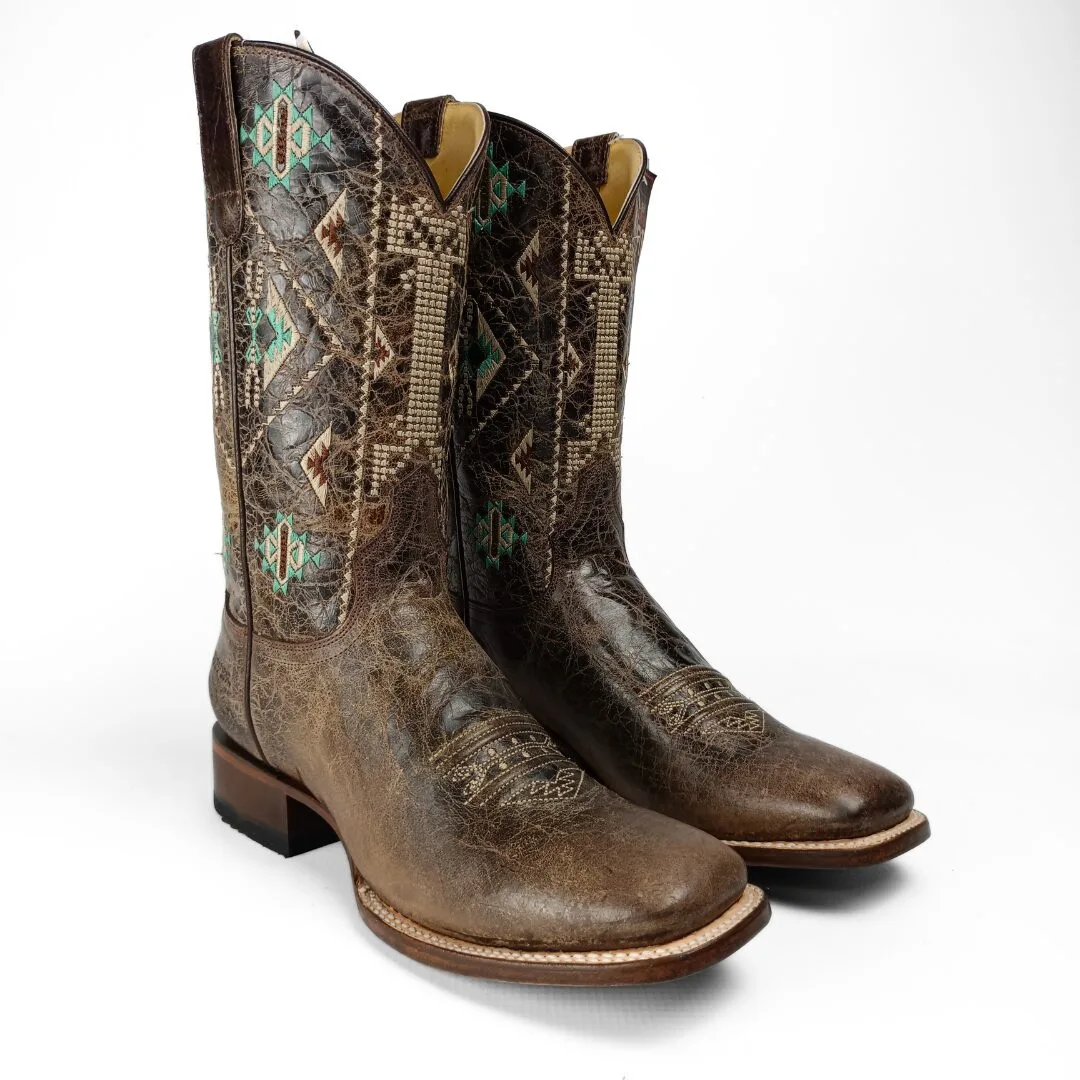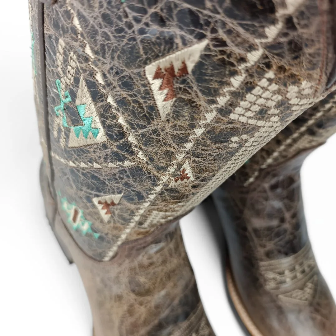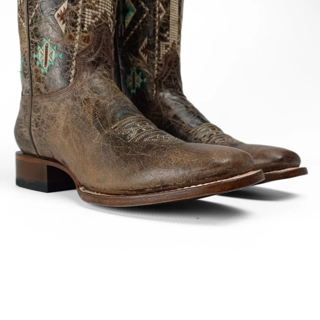 The Out West Women’s Western Boots blend western heritage with modern fashion for a standout look. Crafted from premium waxy brown cowhide leather, these boots feature intricate Aztec embroidery that adds character and style. The square toe and 11-inch shaft give a strong, bold silhouette, perfect for pairing with jeans, skirts, or dresses.