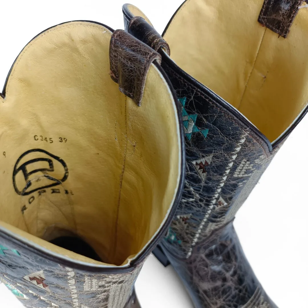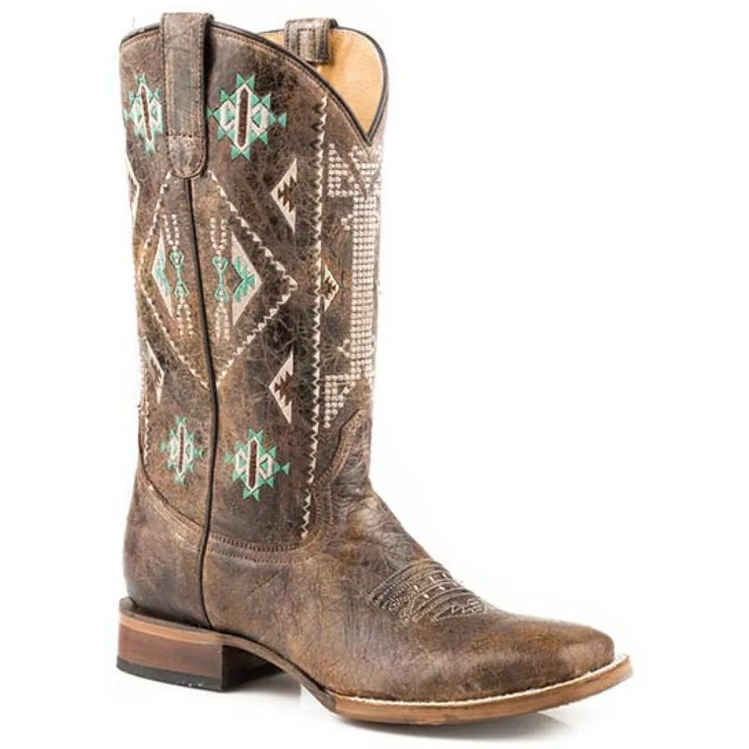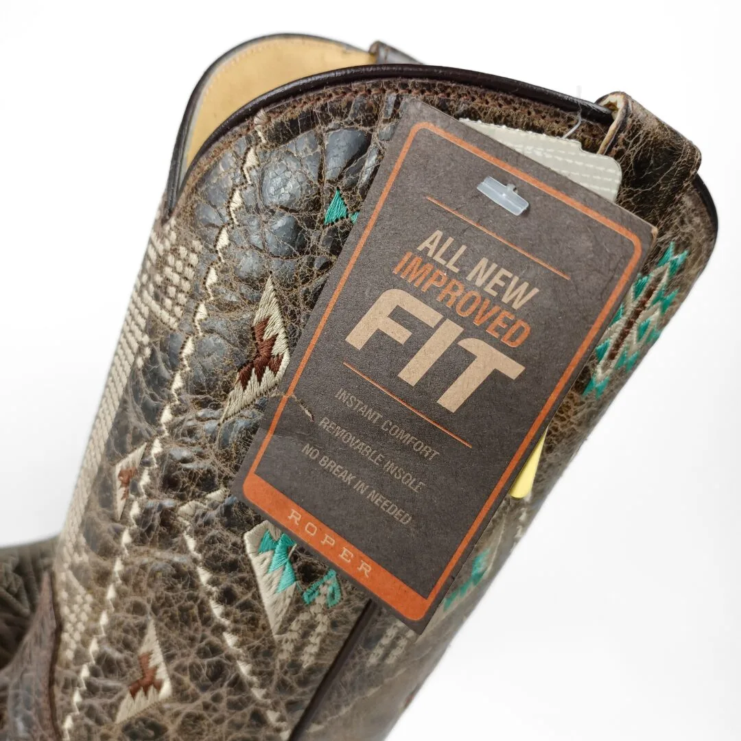 The Out West Women’s Western Boots blend western heritage with modern fashion for a standout look. Crafted from premium waxy brown cowhide leather, these boots feature intricate Aztec embroidery that adds character and style. The square toe and 11-inch shaft give a strong, bold silhouette, perfect for pairing with jeans, skirts, or dresses.