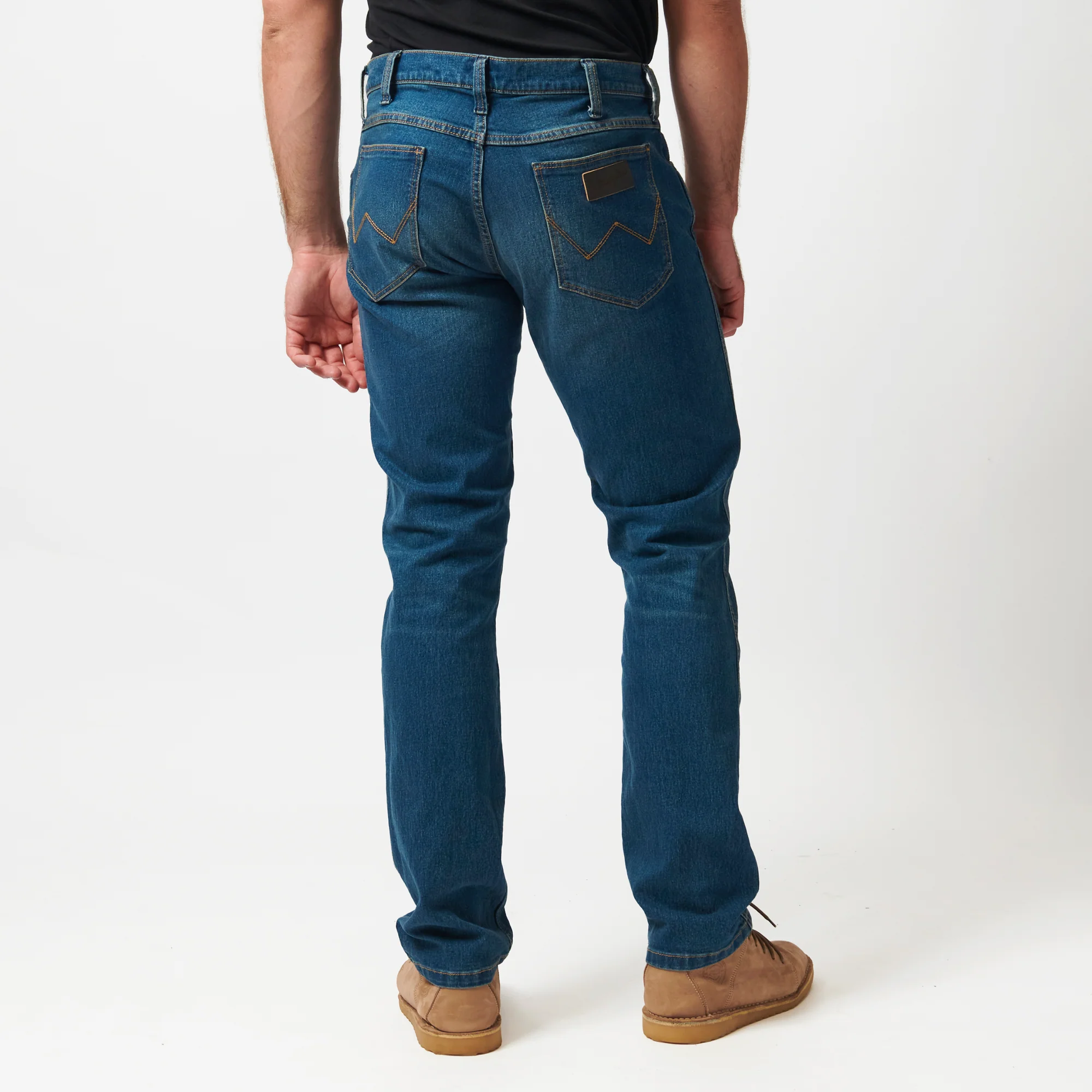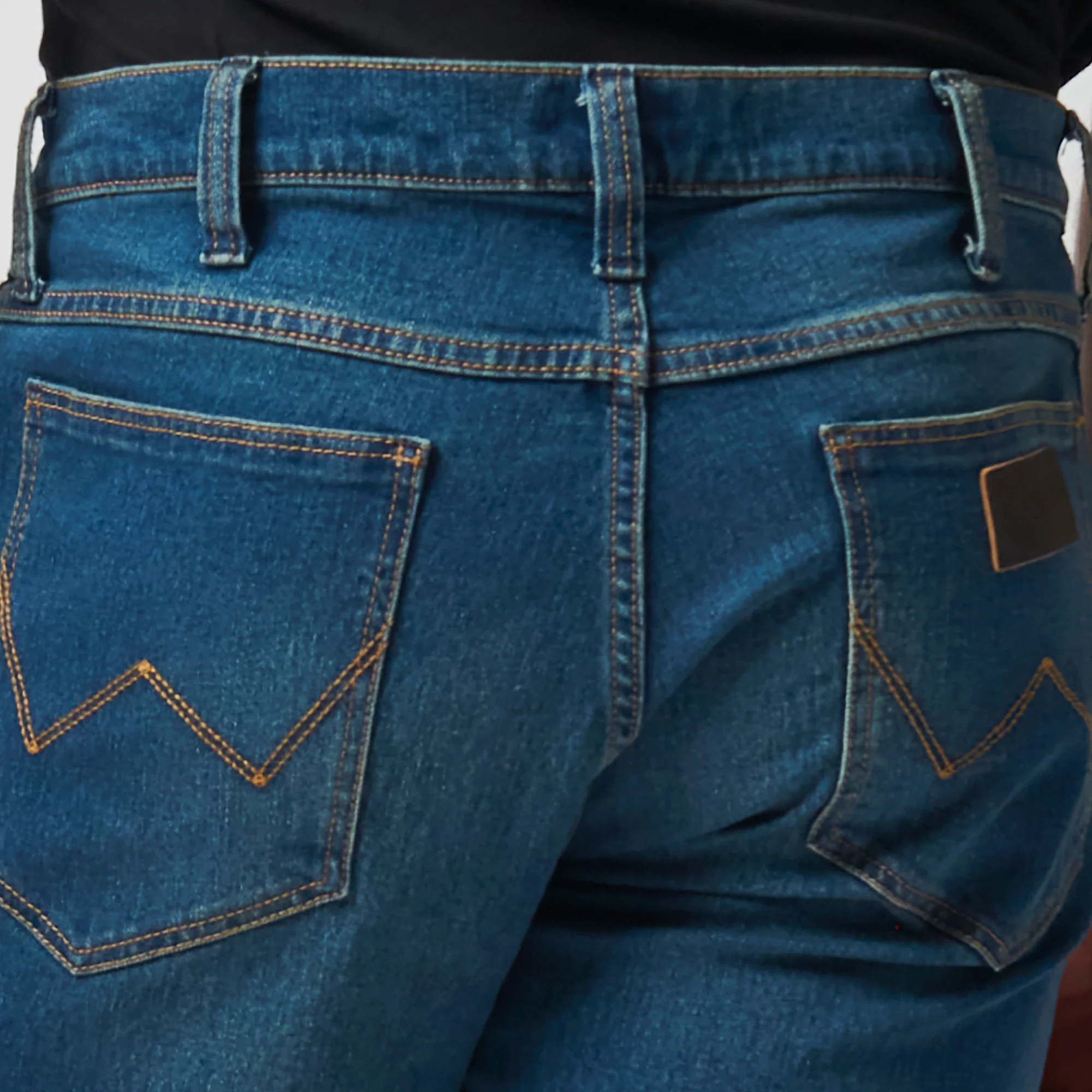 This is the Greensboro Dark Diamond stretch denim. This denim has a mid-rise waist, regular thigh and narrower leg. This denim offers a little bit of stretch for added comfort.